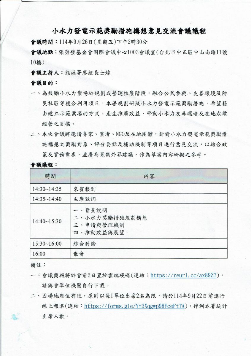 小水力發電示範獎勵措施構想意見交流會議開會通知單